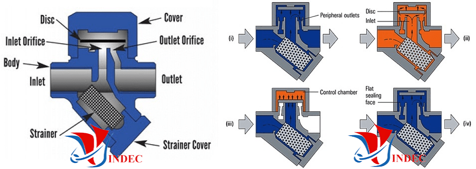 - Ban đầu áp suất sẽ tăng lên làm cho đĩa nâng lên và không khí lạnh ngưng tụ ngay lập tức được thải ra ngoài từ vòng bên trong, bên dưới đĩa qua ba lỗ ngoại vi đi ra ngoài.