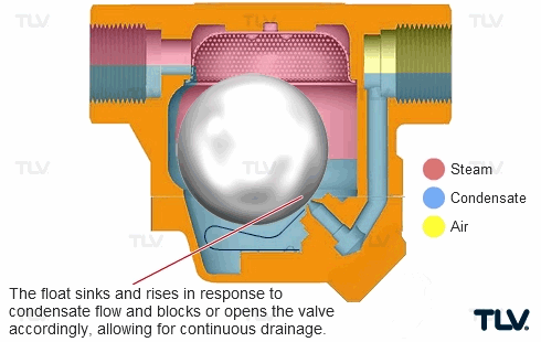 Bẫy hơi phao có thể hoạt động thoát nước ngưng liên tục.