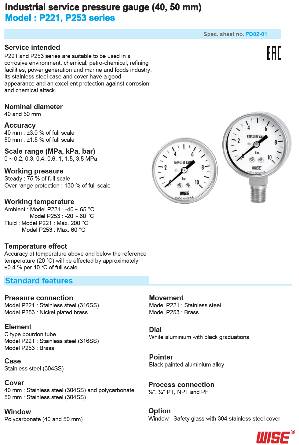 Đồng hồ đo áp suất sử dụng công nghiệp (40, 50 mm) _P221, P253 series