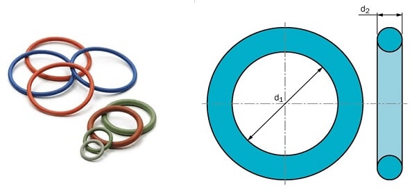 Kích thước của gioăng cao su được xác định bởi đường kính trong d1 và mặt cắt d2.