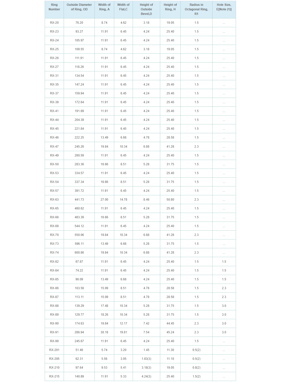 (1) Rings RX-82 through RX-91 only require one pressure passage hole as illustrated. The centerline of the hole shall be located at the mid-point of dimension C.