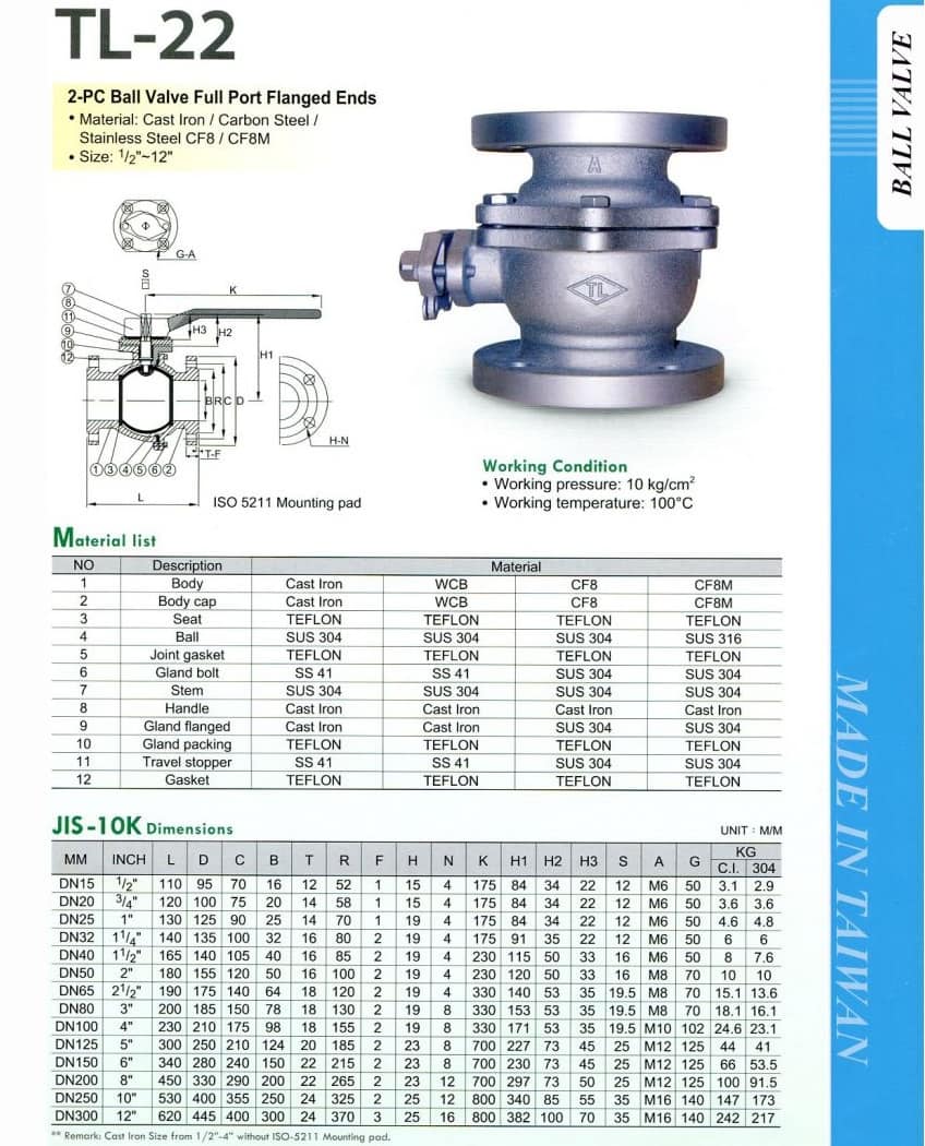 Thông số kỹ thuật của van bi gang TL22