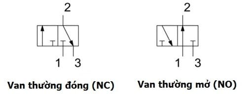 Theo sơ đồ của van khí nén 3/2 bên phải là thường mở (NO) bên trái là thường đóng (NC)